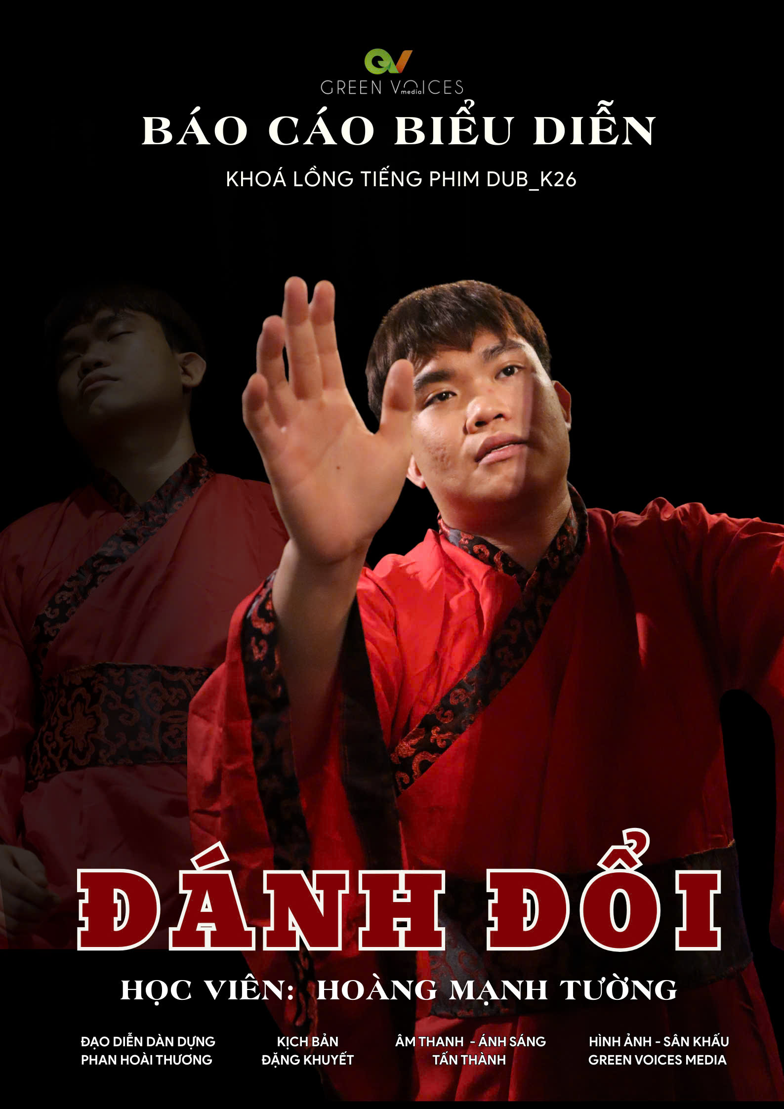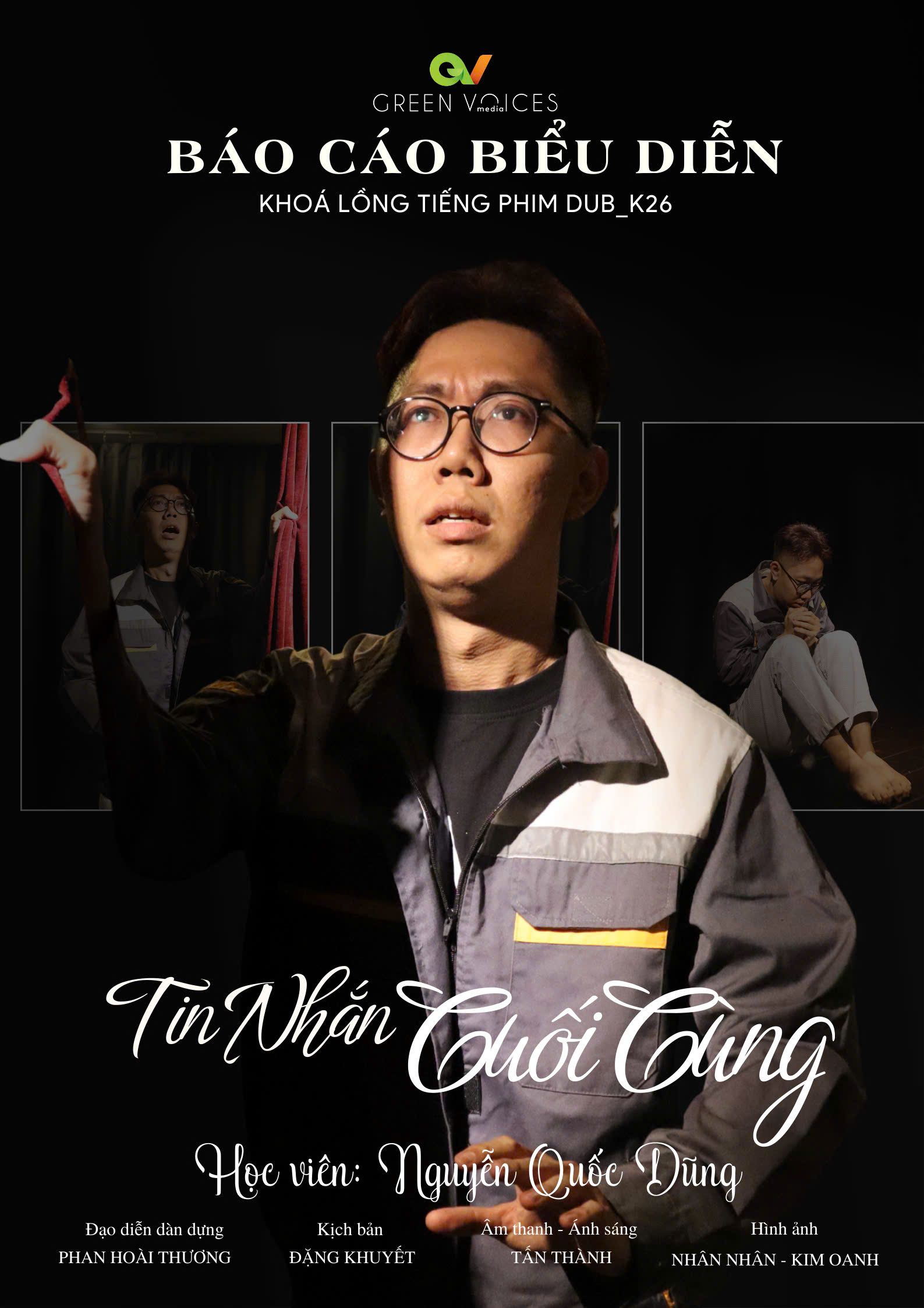 P/S: Khóa Diễn viên Lồng tiếng – K26 là một lớp học đặc biệt với 3 học viên trình diễn (thay vì 6 học viên như dự kiến). Green Voices tin rằng buổi báo cáo sẽ mang đến cho phụ huynh, bạn bè và người thân những trải nghiệm cảm xúc chân thật, sâu sắc và đáng nhớ.